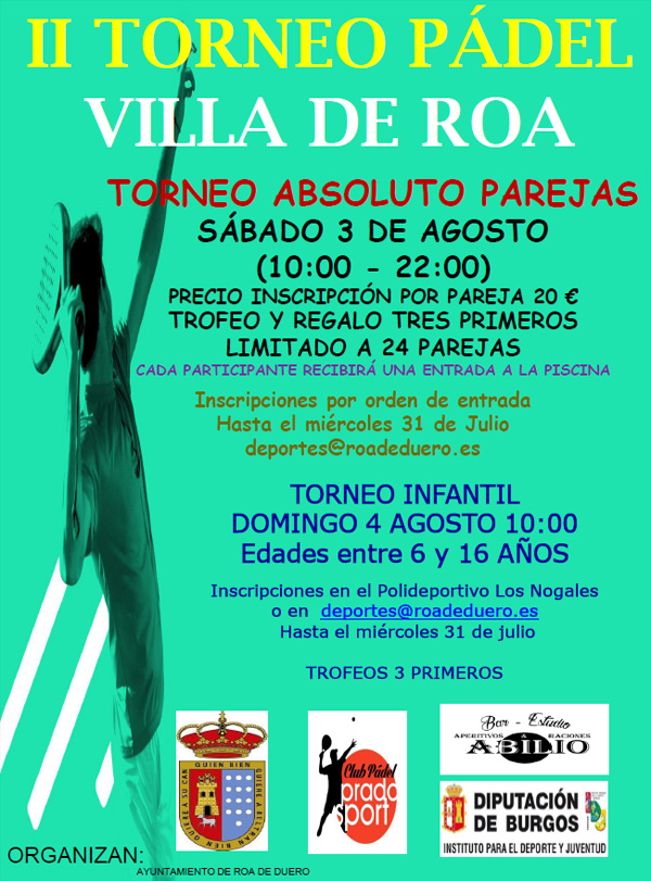 El sábado 3 de agosto se disputará en Roa el II Torneo de Pádel "Villa de Roa", organizado por el Ayuntamiento de Roa, el Instituto Provincial para el Deporte y Juventud de Burgos y Pradosport Pádel.