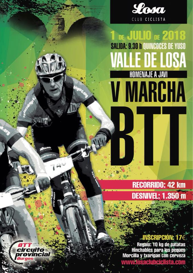 El Ayuntamiento del Valle de Losa, el Instituto Provincial para el Deporte y Juventud de la Diputación Provincial de Burgos y el Club Ciclista Losa, organizan la V Marcha BTT Valle de Losa en Quincoces de Yuso (Burgos), que tendrá lugar el día 1 de Julio del 2018.