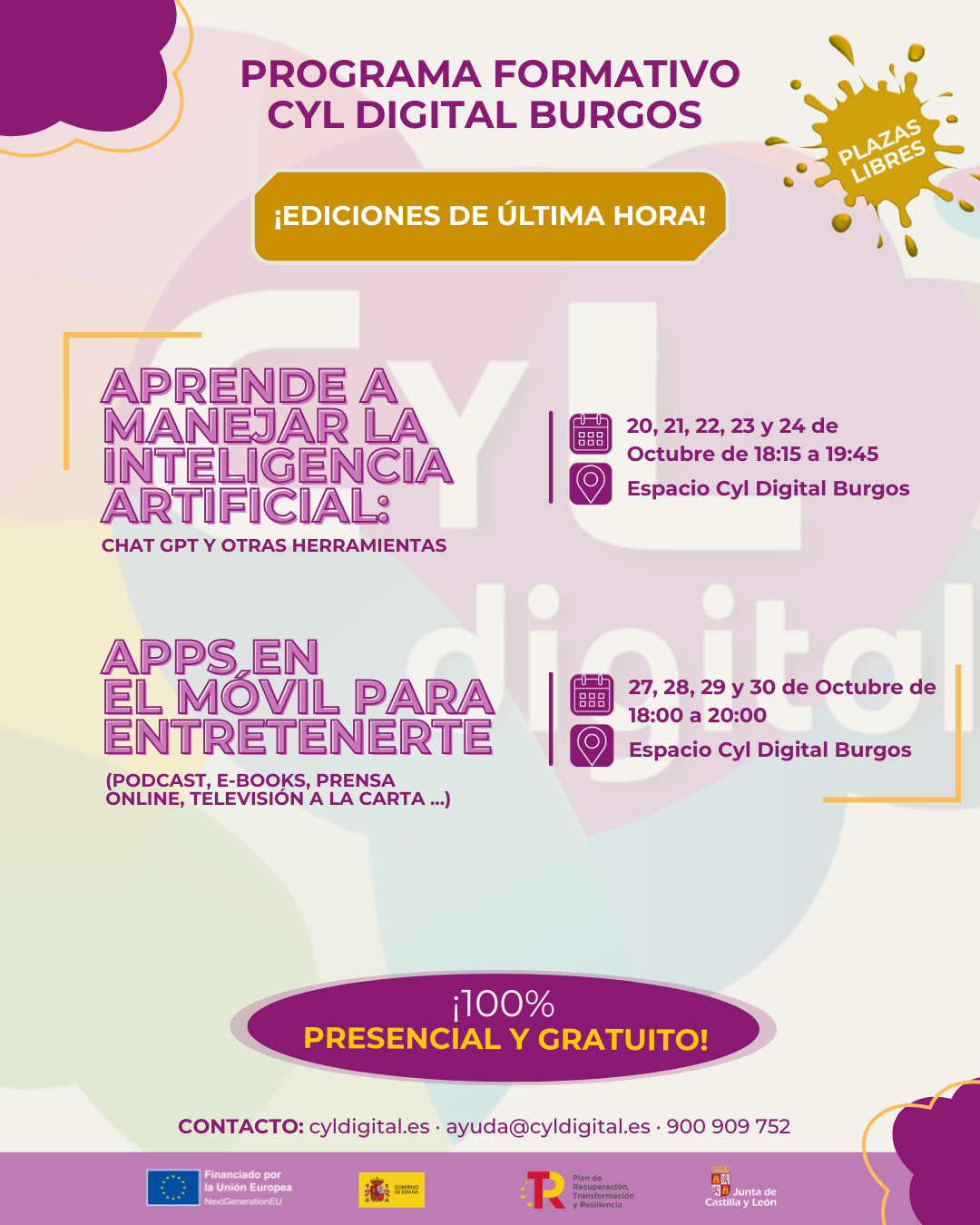 Los días 27, 28, 29 y 30 de octubre se va a impartir un curso presencial y gratuito en el Espacio CyL Digital de Burgos. Se verá el uso de ChatGPT y otras herramientas.