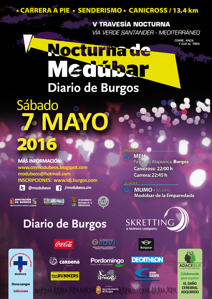 La prueba, organizada por el Club de Montaña Modubeos y el Instituto provincial para el Deporte y Juventud (IDJ) de la Diputación de Burgos, en colaboración con el Ayuntamiento de Modúbar, pasará a denominarse 'Nocturna de Modúbar - Diario de Burgos'. Este cambio es fruto del acuerdo de patrocinio alcanzado entre este medio de comunicación, que celebra este año su 125 aniversario y el Club de Montaña Modubeos. Así, Diario de Burgos será el patrocinador principal de la Nocturna de Modúbar durante los próximos cinco años.