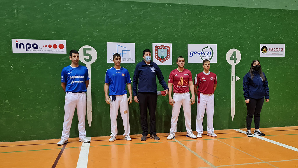La jornada comenzó con el partido previo que enfrentaba a jugadores en edad juvenil de la Escuela de Pelota del CP San Cristóbal. Olave y Llorente se impusieron a Martínez y Llorente por 18 a 10.