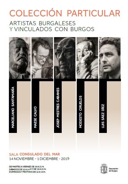 La Sala del Consulado del Mar acoge desde el jueves 14 de noviembre hasta el domingo 1 de diciembre la exposición ‘Colección particular – Artistas burgaleses y vinculados a Burgos’ compuesta por un total de 25 obras inéditas de algunos de los artistas burgaleses más sobresalientes del siglo pasado y primera década del actual como son Marceliano Santa María, Maese Calvo, Modesto Ciruelos, Vela Zanetti o Luis Sáez. Asimismo, se mostrarán diversas piezas de pintores vinculados a Burgos como Josep Mestres Cabanes o Carmelo García Barrena.